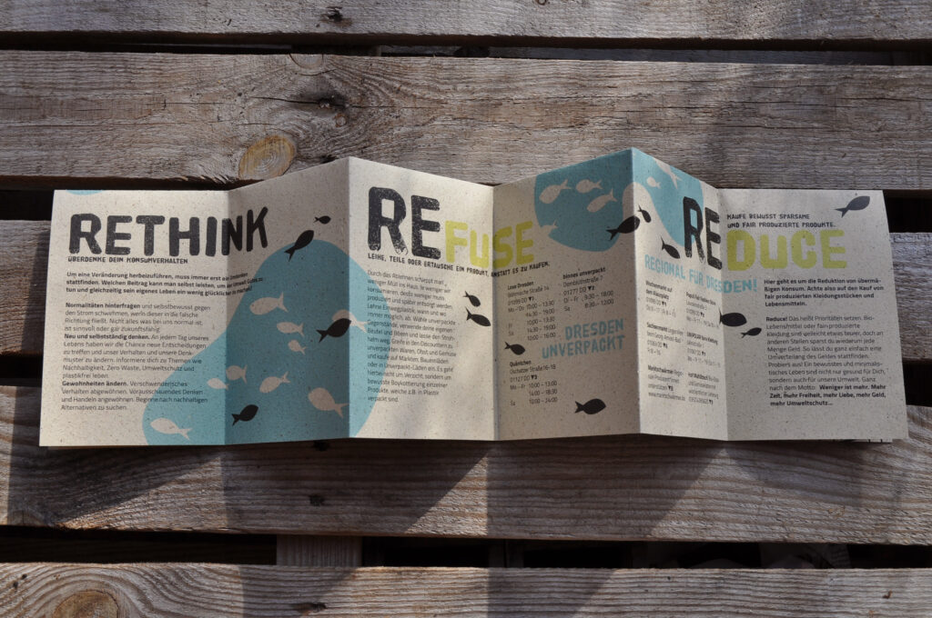 Diese Zine macht es uns leichter den Themen wie Nachhaltigkeit und Müllvermeidung näher zu kommen und damit neue Konsumgewohnheiten in unseren Alltag zu integrieren. Mithilfe der „REs“, welche als eine Art Faustregel fungieren, wird durch das Thema geführt: Rethink, Refuse, Reduce, Reuse und Recycle markieren hierbei einzelne Stationen im Prozess der Müllvermeidung. Die kurzen Erklärungen und Tipps, abgestimmt auf Dresden, sollen es einem so einfach wie möglich machen, in das Thema einzusteigen und selbst kreativ zu werden.